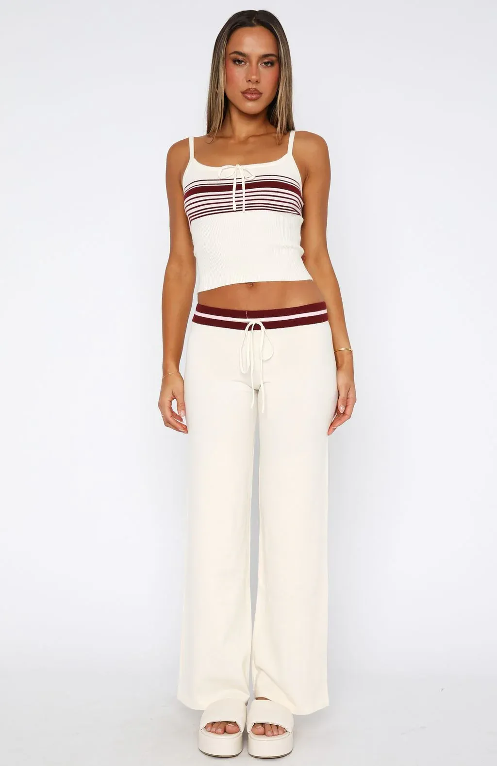 The Keep Driving Knit Pants in Burgundy Stripe are the perfect blend of cosy and cute! Features thick elasticated waistband with drawstring ties for a desirable fit and stretch fabrication for an easy slip on and off. Team with the matching Keep Driving Knit Cami Top in Burgundy Stripe for the cutest roadtrip fit!