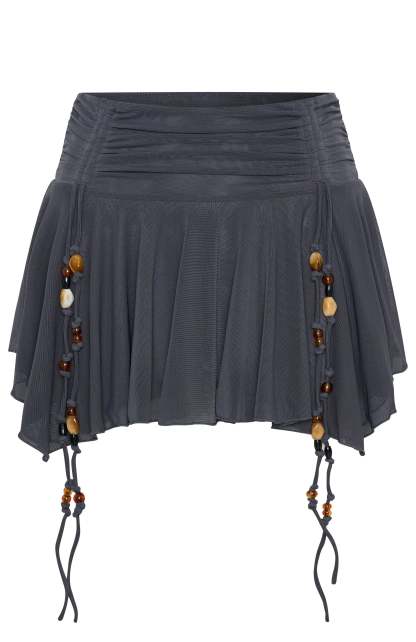 Let the To My Heart Mini Skirt Charcoal be your go-to for fun! Featuring a thick, stretch waistband, mini length, pixie hem design on skirt, mesh material and front beaded detailing. Complete your look with the matching To My Heart Halter Top Charcoal!?