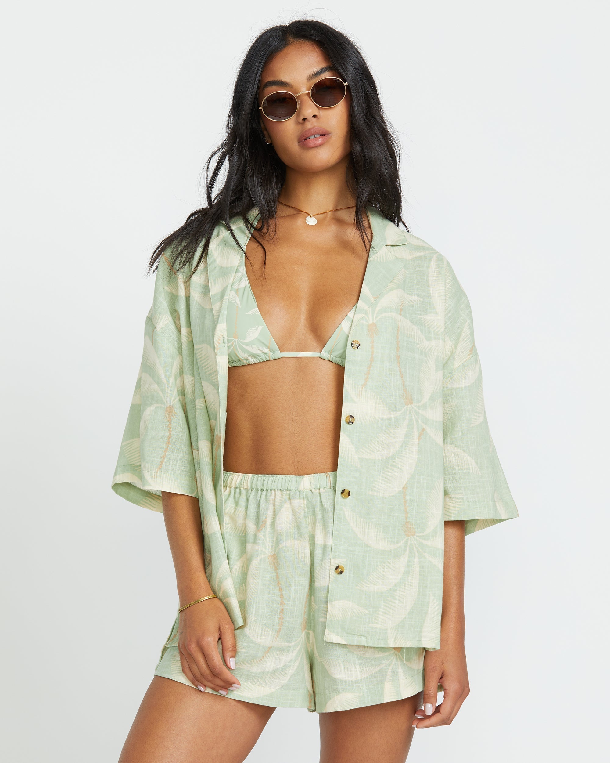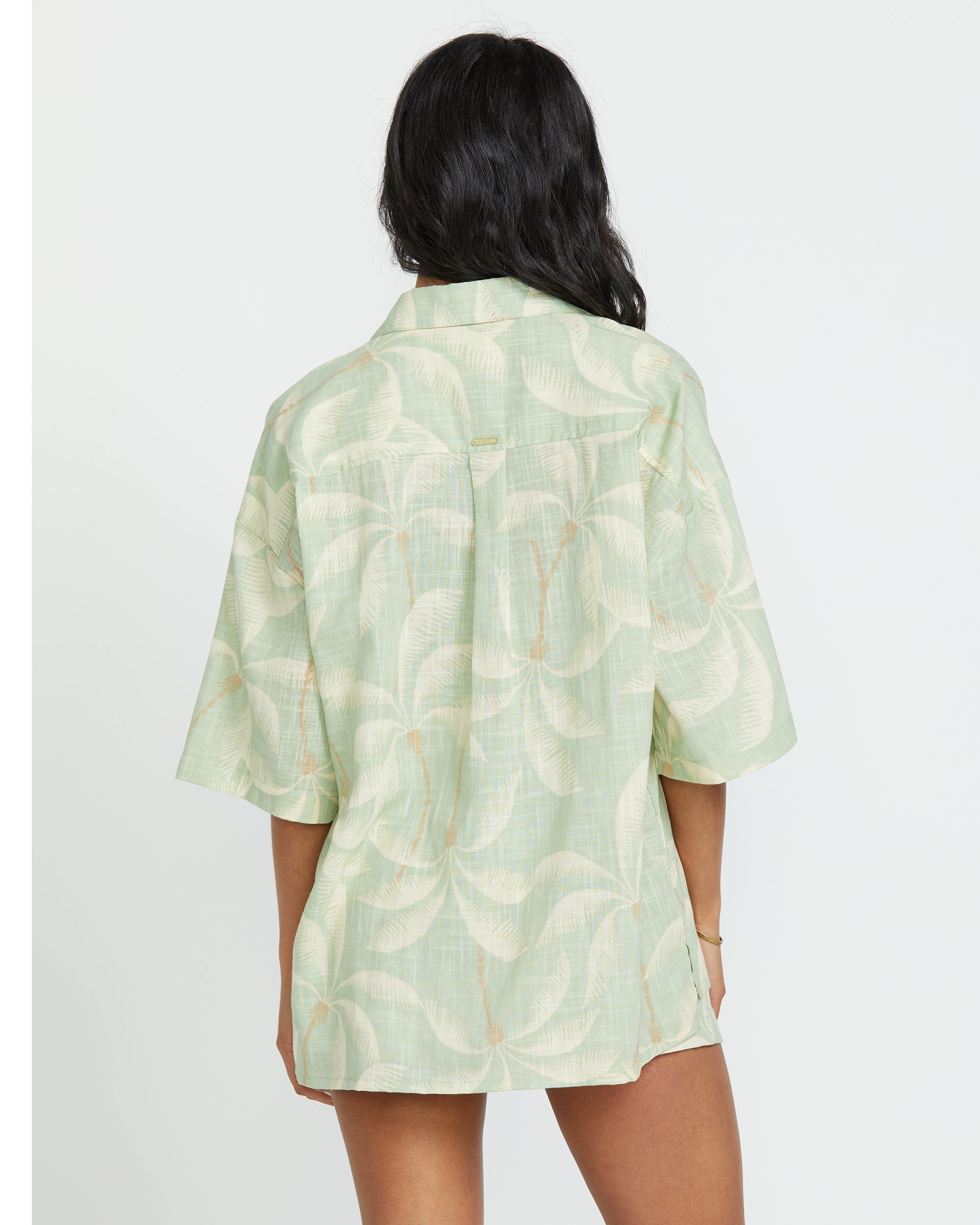 Kick back in our Billabong 100% cotton beach shirt. The oversized fit and short sleeves keep things breezy, while a button-down front and metal plate detail add a stylish touch. Perfect for relaxed days in the sun. Featured here in the Pistachio colorway.