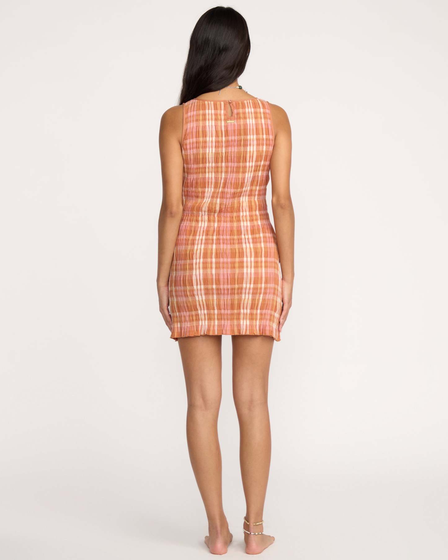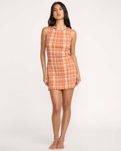Our form-fitting mini dress hugs your curves with soft cotton-blend comfort. The all-over smocking adds sophisticated texture, while the boat neckline and metal plate detail create an effortlessly polished look. Featured here in the Orange colorway.