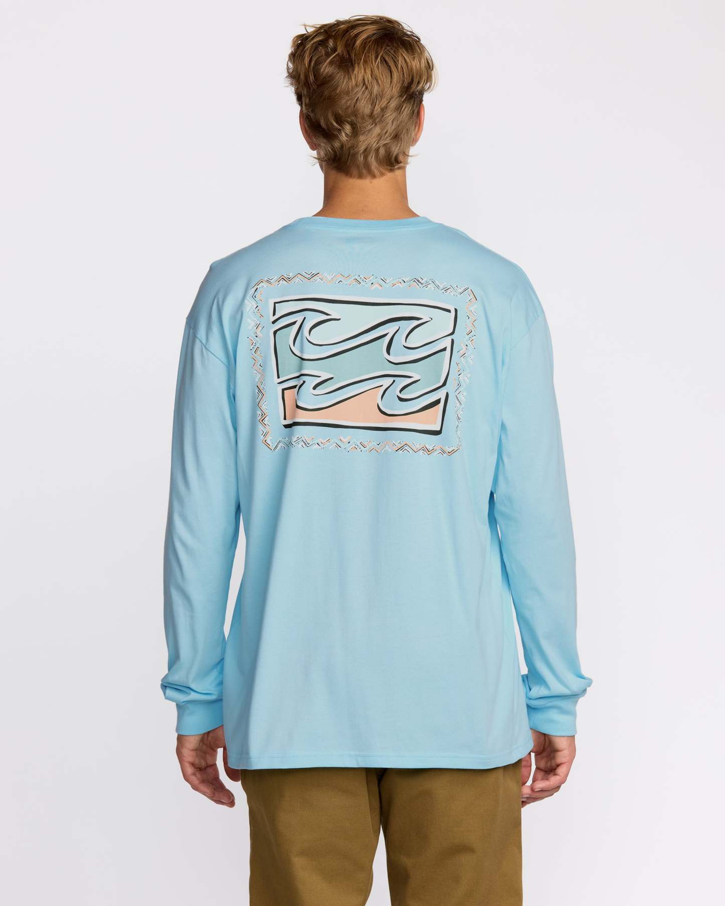 Our classic-fit long sleeve t-shirt brings double the style with front and back screen prints. Relaxed shoulders and garment-washed pure cotton create the laid-back comfort you're after. Featured here in the Blue colorway.