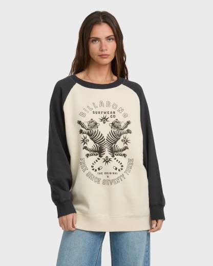 - Pullover crew neck, contrast raglan sleeves, graphic screen print