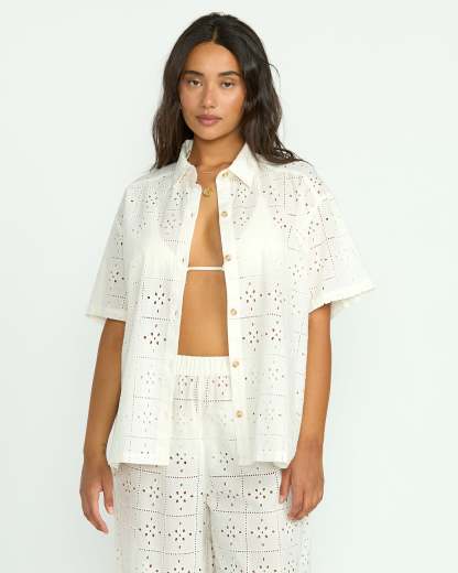Our 100% cotton eyelet coverup top is oversized bliss. With short sleeves and a button-down closure, breezy yet structured, this women's shirt is ultra-lightweight, breathable perfection to throw on over swimwear or keep cool in casual style. In crisp white eyelet, it's a breath of fresh air.