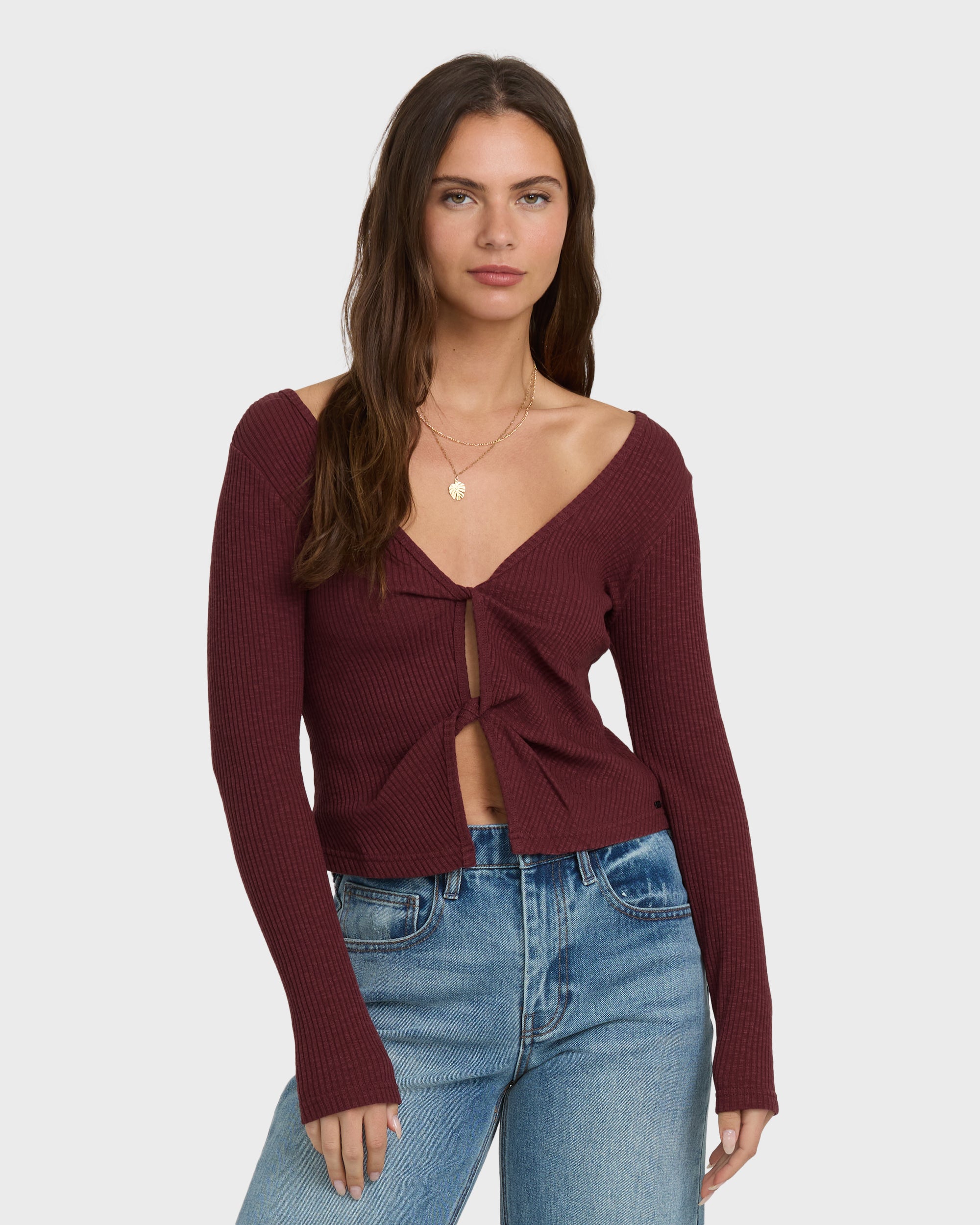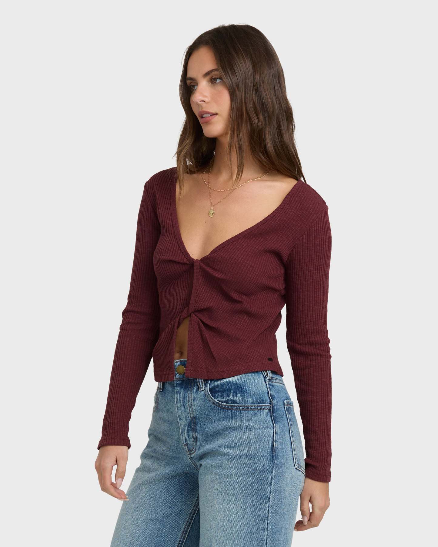 Our fitted long sleeve knit top doubles your style options with a two-way wear design. The double twist detail and metal plate accent create an effortlessly cool look in soft, stretchy ribbed fabric. Featured here in the Red colorway.