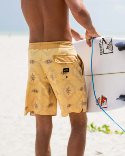 Lightweight yet durable poly-cotton stretch boardshorts with a versatile 18" lo tide length. Featuring handy back patch and side seam pockets, plus a secure drawstring waist, these Billabong shorts were made for endless summer adventures. Featured here in the Dust Yellow colorway.