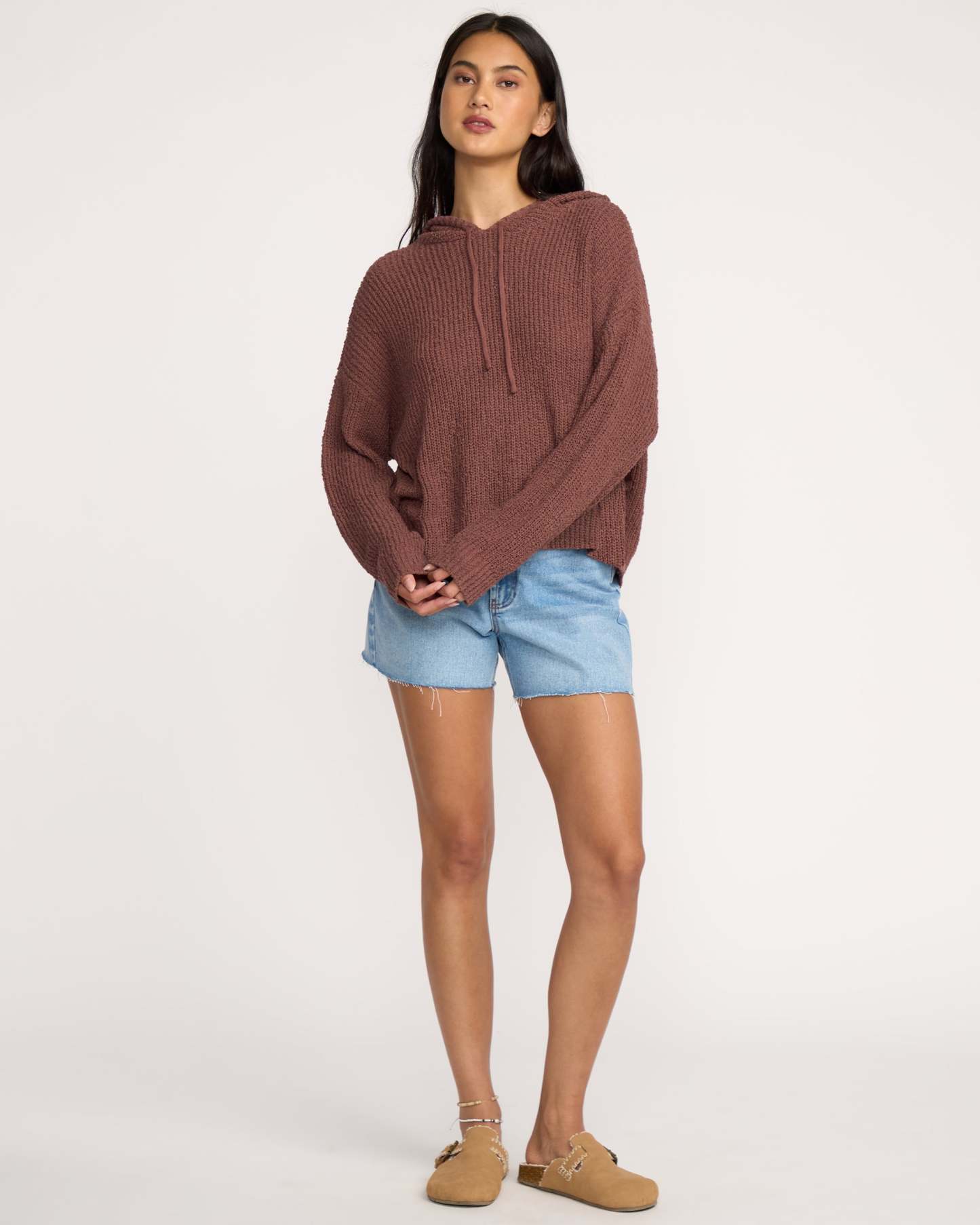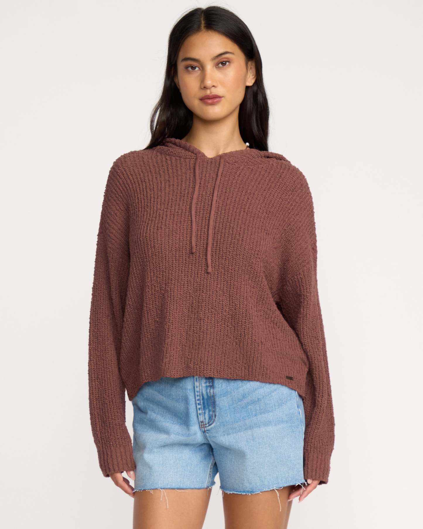 Our oversized hooded sweater brings laid-back style with its cotton-blend loose weave construction. A sleek metal plate detail adds a premium touch to this cozy, relaxed-fit essential. Featured here in the Brown colorway.