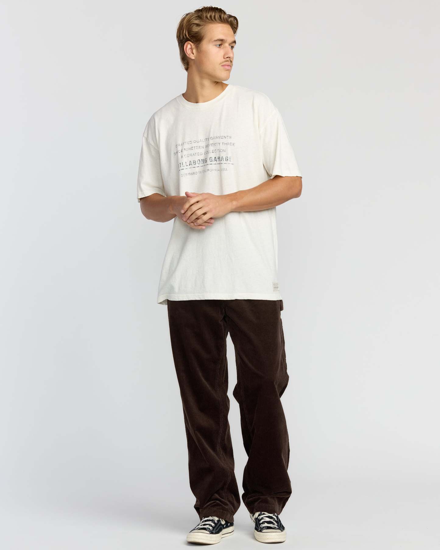 Our corduroy garage pants blend utility and comfort with a relaxed straight fit and elastic drawcord waist. Multiple pockets, including a tool loop and patch pockets, keep your essentials close at hand. Featured here in the Brown colorway.