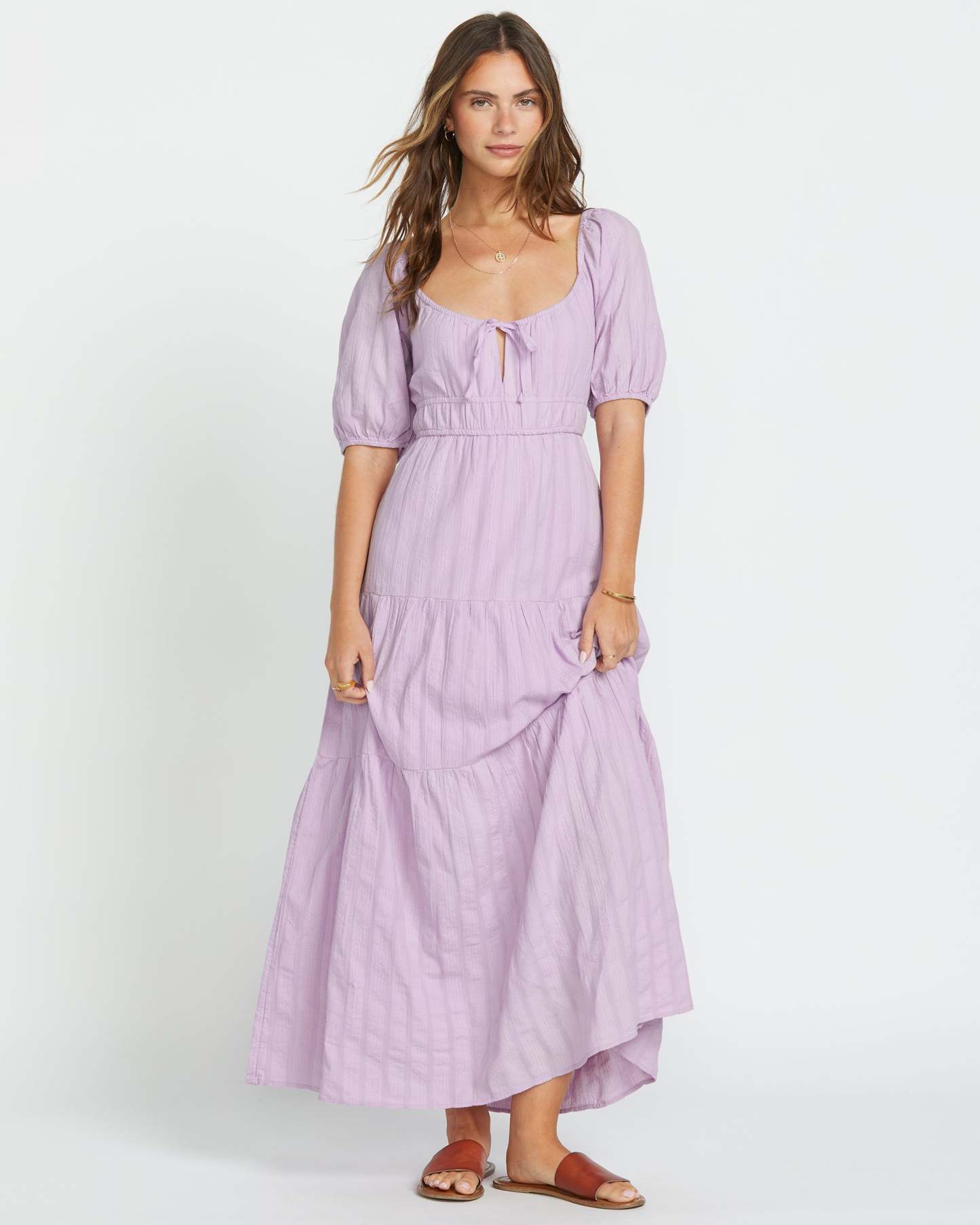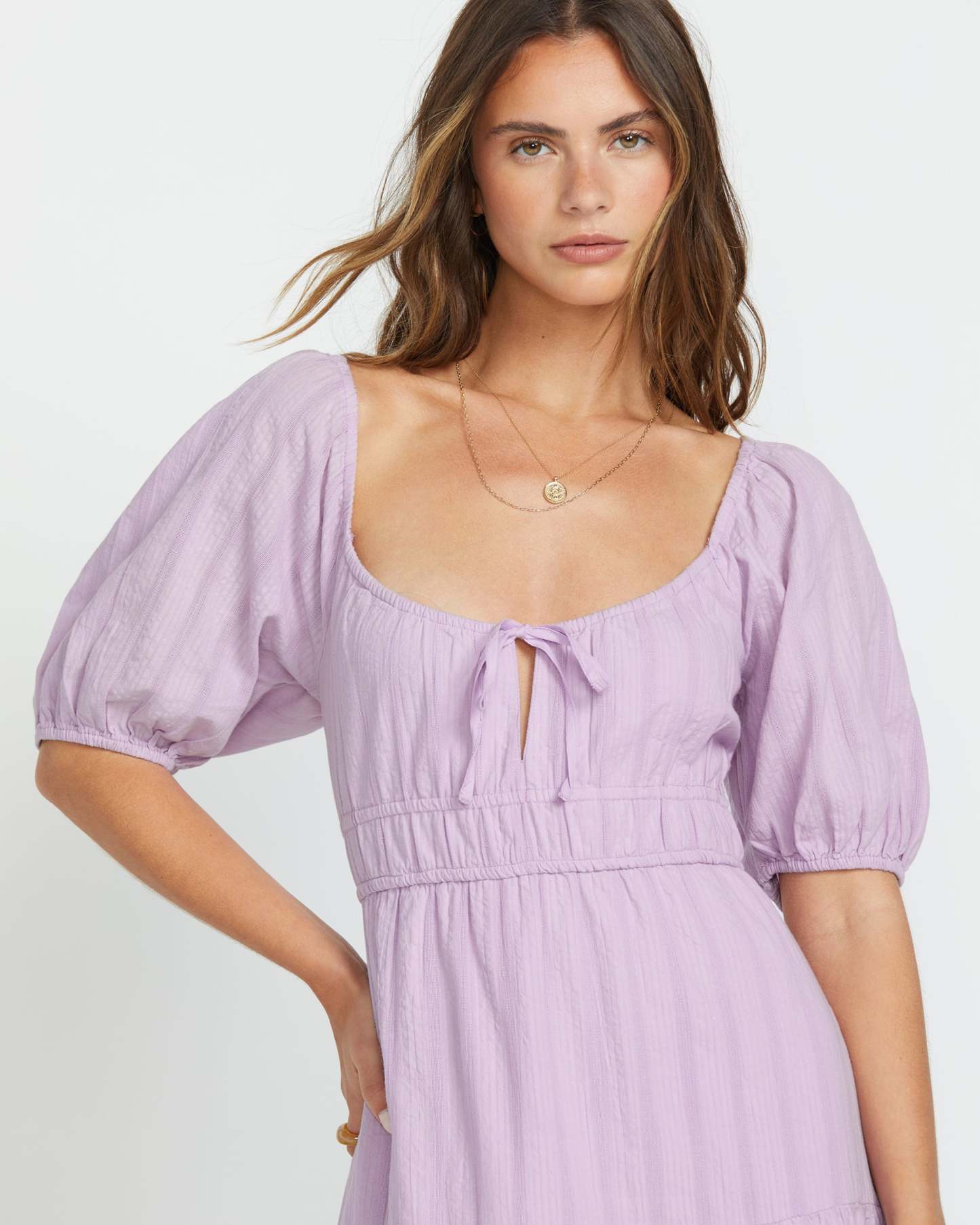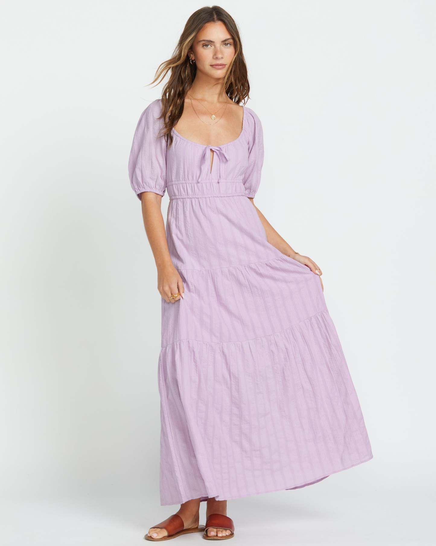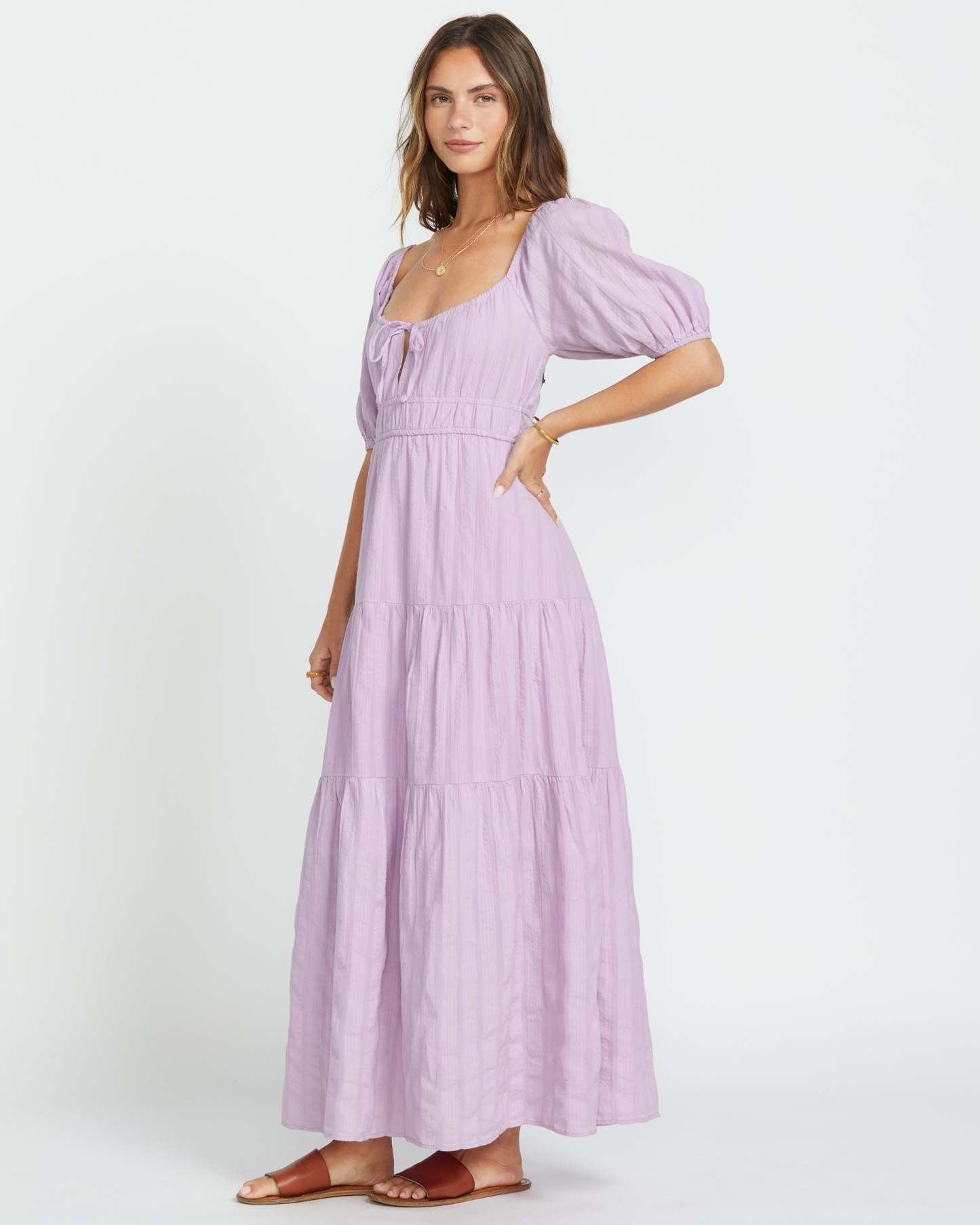 Cotton dobby stripes make this maxi dress a lilac lover's dream. A fitted bodice with puff sleeves and a self-tie detail complements the easy, tiered skirt for an ultra-flattering look. Made from breathable 100% cotton for warm-weather comfort. Featured here in the Peaceful Lilac colorway.
