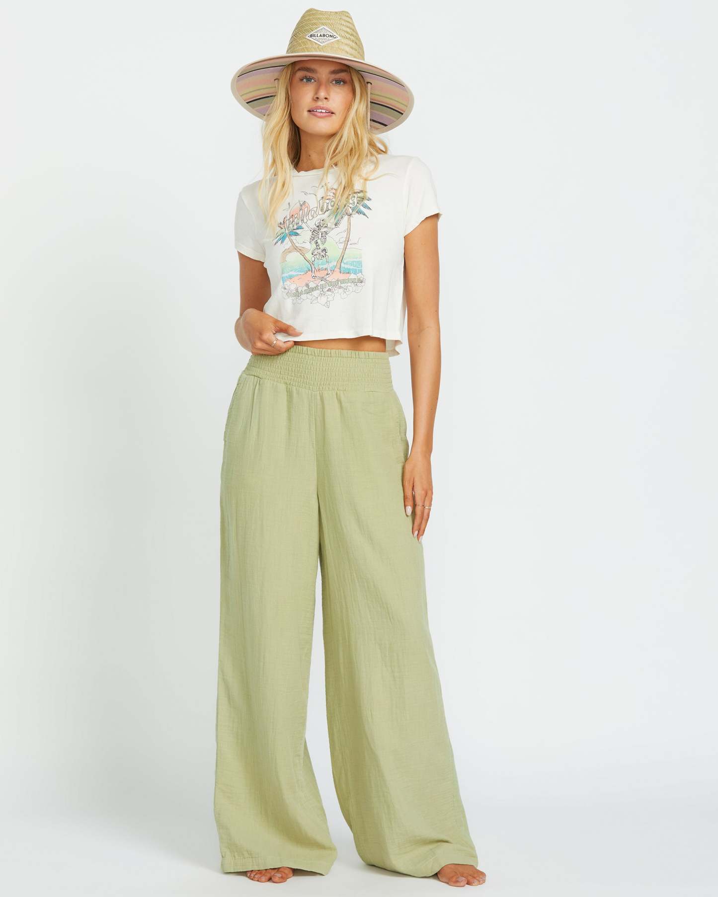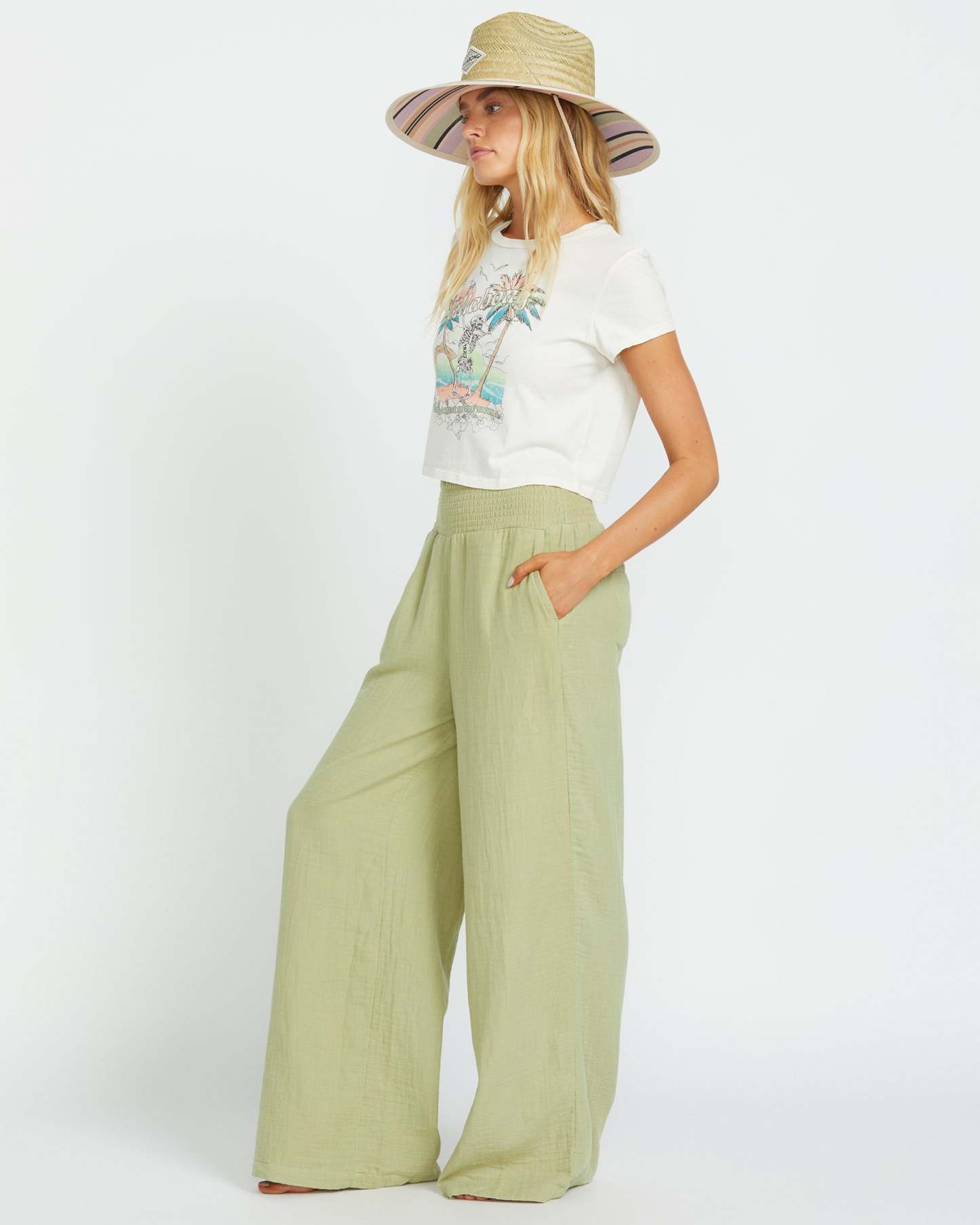 Breathe easy in these soft, relaxed-fit gauze pants from Billabong Women. The 100% cotton double gauze fabric and smocked elastic waist keep you comfy while front slash pockets and back patch pockets stash your essentials. Wear them everywhere. 32" full length. Featured here in the Avocado colorway.