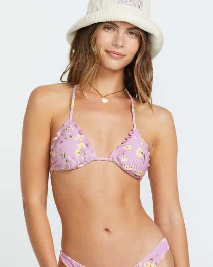 Slip into Peaceful Petals and unleash your free spirit. This ruffled triangle-style bikini top features adjustable ties and removable cups for personalized comfort. Crafted from partially recycled polyester and elastane Tanlines Rib fabric, it's as pretty and carefree as your ocean-filled daydreams. Featured here in the Amethyst Smoke colorway.