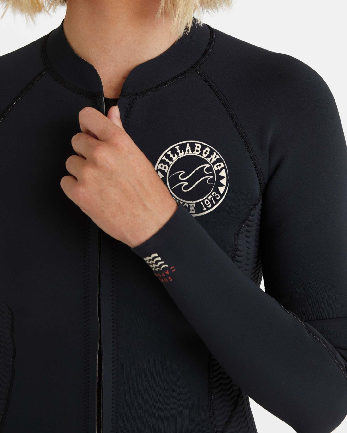 Carve your own path in this stretchy, conscious surf jacket made from a recyclable natural rubber blend. Front zip silhouette lets you flow with ease. Featured here in the Black colorway.