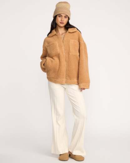 Our cozy sherpa shacket brings oversized comfort to chilly days. Zip up and stuff your essentials in the chest and on-seam pockets, then adjust the cuffs for that perfect fit. Featured here in the Beige colorway.