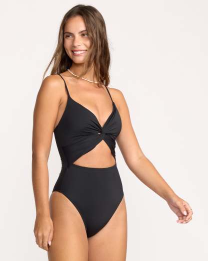 Our sleek one-piece swimsuit features a flirty front twist and cut-out detail that adds just the right amount of style. Crafted with partially recycled materials and finished with medium coverage for confidence-boosting comfort. Featured here in the Black colorway.