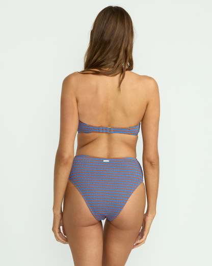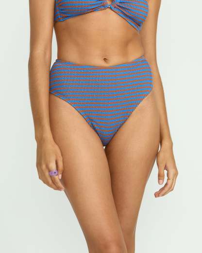 The Summer Hi Stripe Maui Bikini Bottom flatters with a high-waisted, below belly button silhouette. Fun textured stripes blend stretchy, partially recycled performance fabrics for a smooth, comfortable fit. It pairs perfectly with its matching bandeau top.