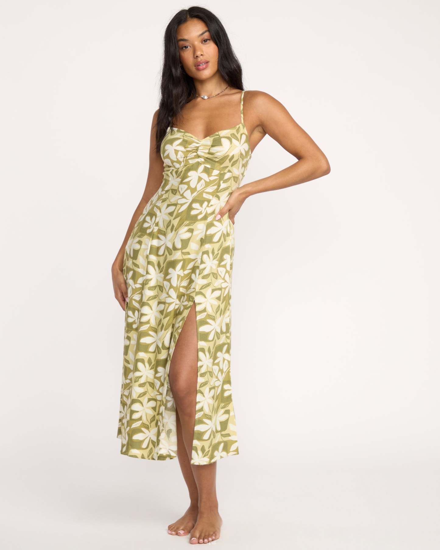 Our body-skimming midi dress brings romance with its sweetheart neckline and graceful front slit. The smocked back bodice ensures a perfect fit, while soft viscose fabric keeps you comfortable all day. Featured here in the Green colorway.