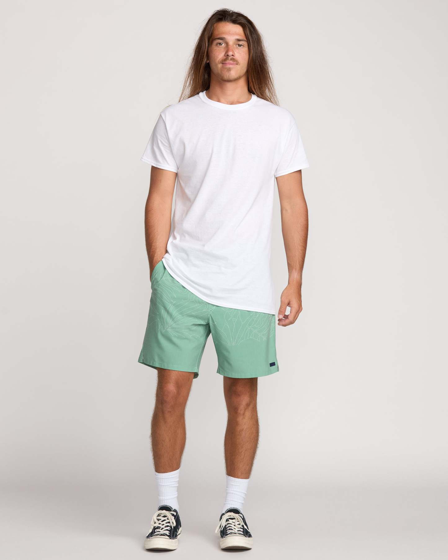 Stretchy, quick-dry hybrid shorts bring active comfort to every adventure. Moisture-wicking stretch fabric, relaxed regular fit, and adjustable elastic waist ensure all-day flexibility. Bonus: Multiple pockets stash all your essentials for seamless transitions from surf to street. Featured here in the Mist Green colorway.