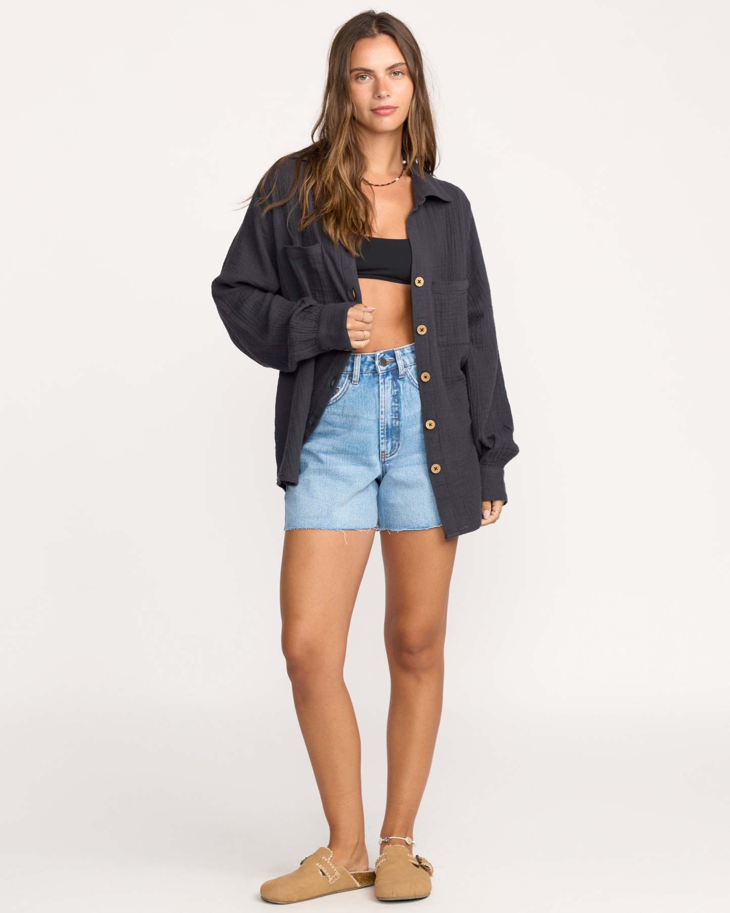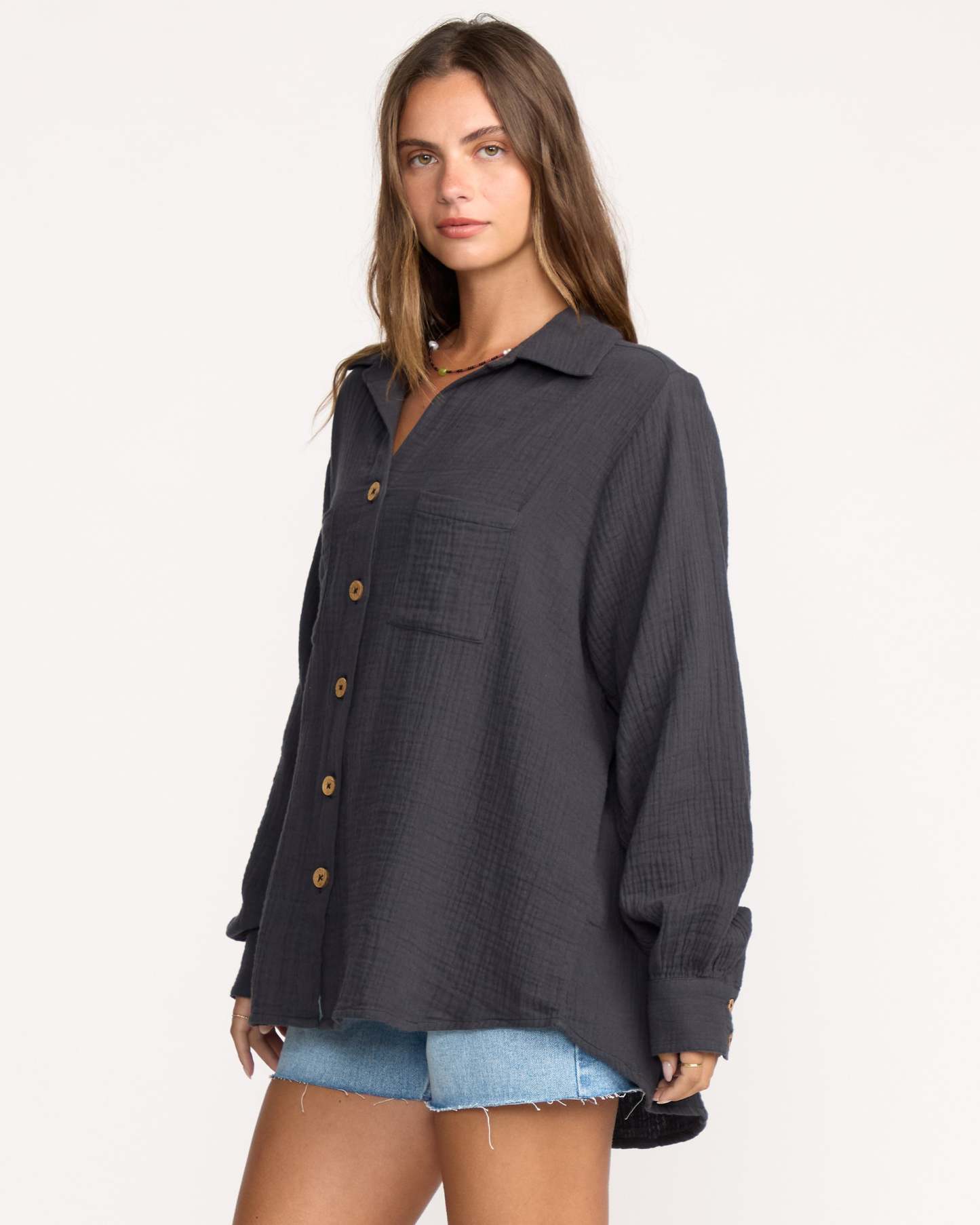 Breezy 100% cotton double gauze shirt with laid-back, oversized fit. Long sleeves, button-down closure, patch pockets, and metal plate. Featured here in the Black Sands colorway.