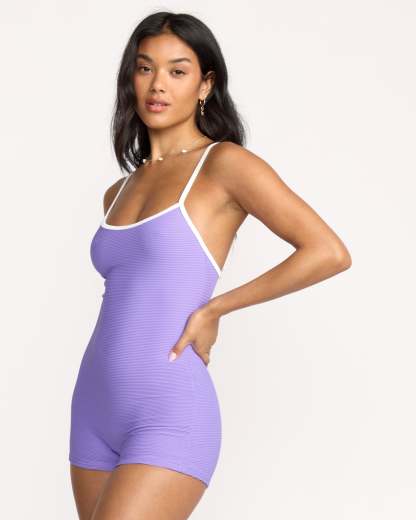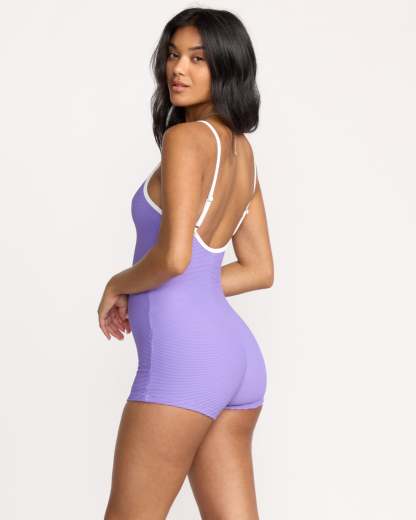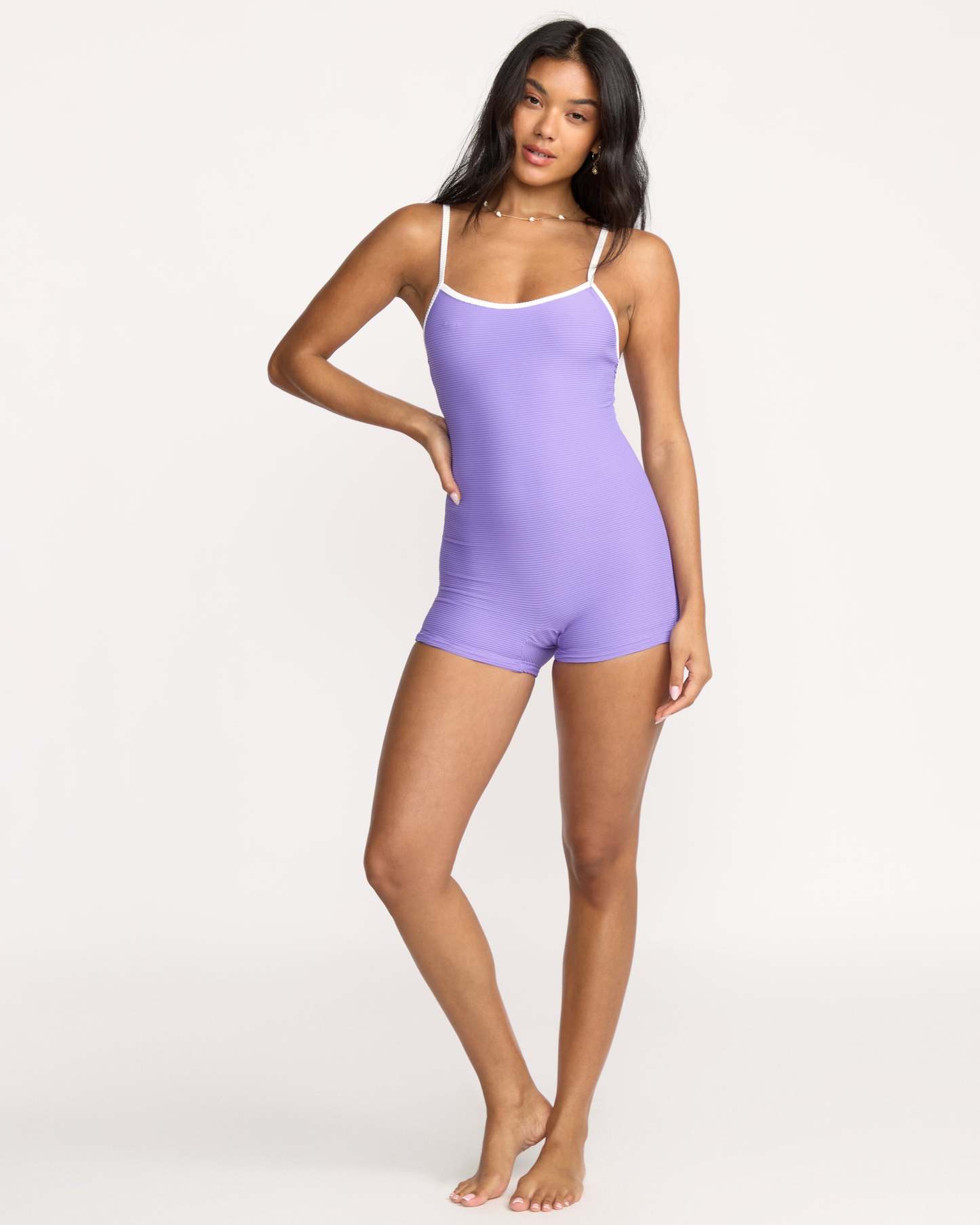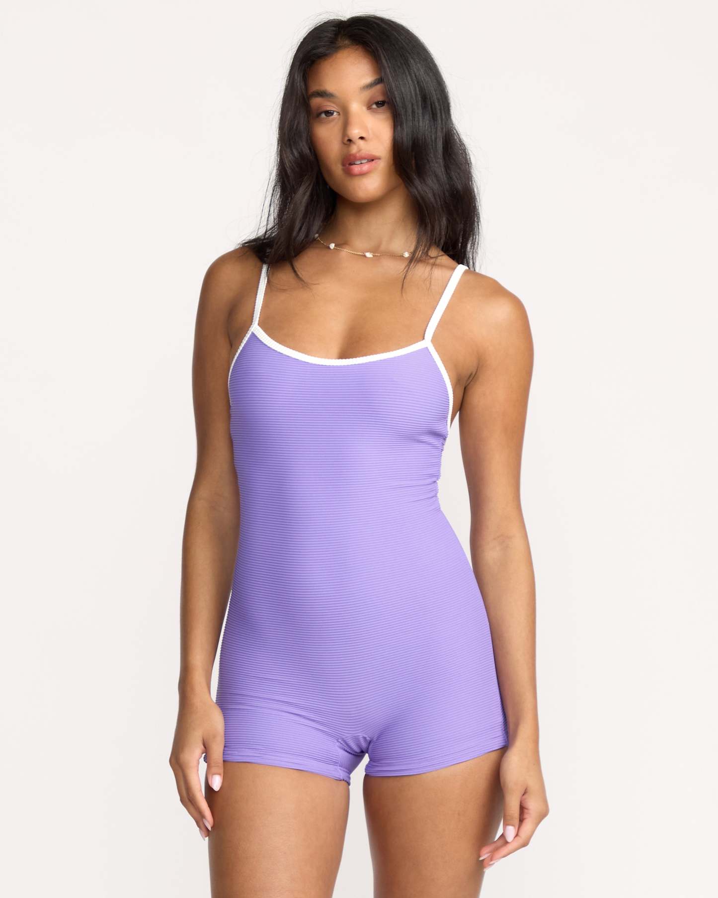 Our retro-inspired tank surfsuit keeps you stylishly secure with adjustable straps and contrast piping details. The boyshort cut offers full coverage, while the partially recycled fabric moves with every paddle or plunge. Featured here in the Purple colorway.