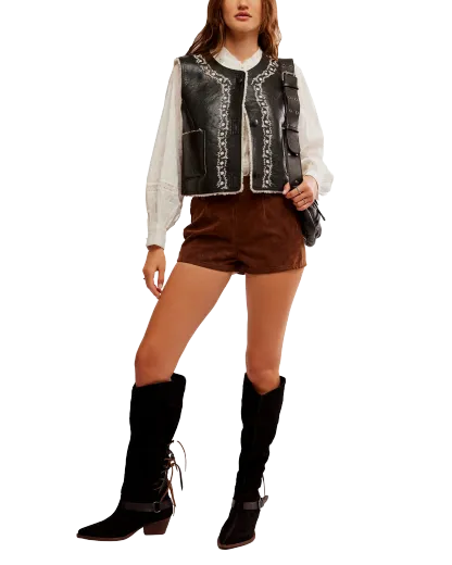 The Women's Travellers Leather Waistcoat in Black & Cream from Free People is a chic woven gilet designed for both style and comfort. Crafted from 100% viscose coated with polyurethane, it offers a sleek, leather-like appearance. The contrasting black and cream colour scheme adds a bold, sophisticated touch. This waistcoat features luxurious faux fur trim, enhancing its bohemian charm and providing extra warmth. Designed with a flattering, tailored fit, it includes practical front pockets and a button-down closure. Perfect for layering over your favourite tops and dresses, the Travellers Leather Waistcoat combines edgy elegance with versatile functionality for any occasion.