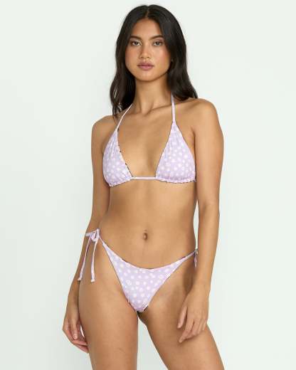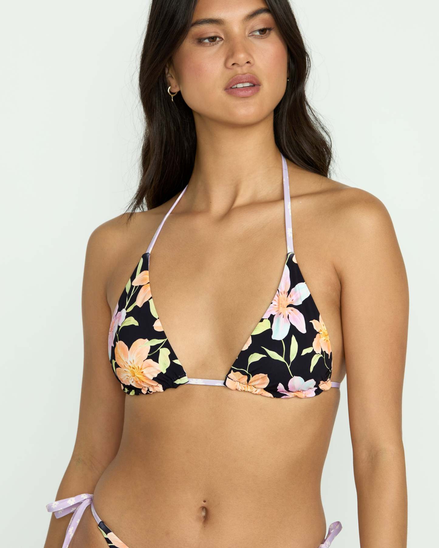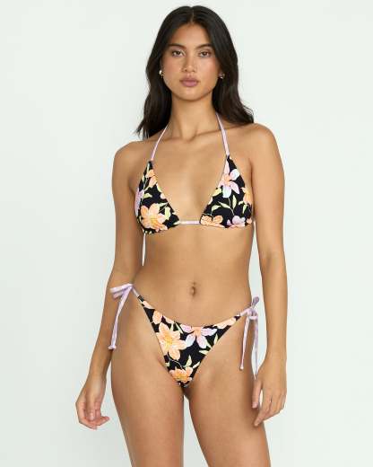 Our reversible women's bikini top features an oversized peach and lavender floral pattern with flattering triangle cups and adjustable ties for the perfect fit. A partially recycled nylon construction comes with removable cups.